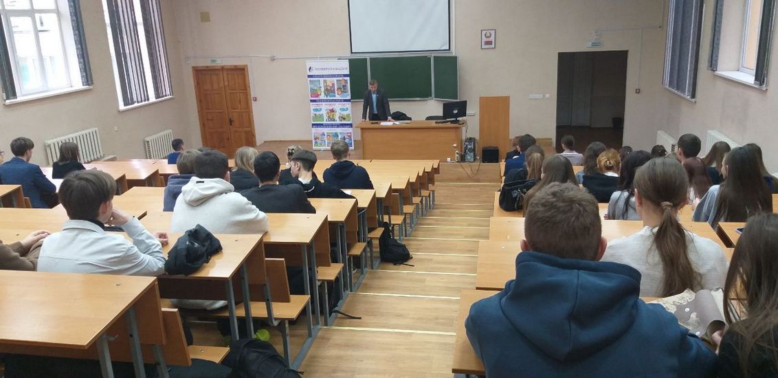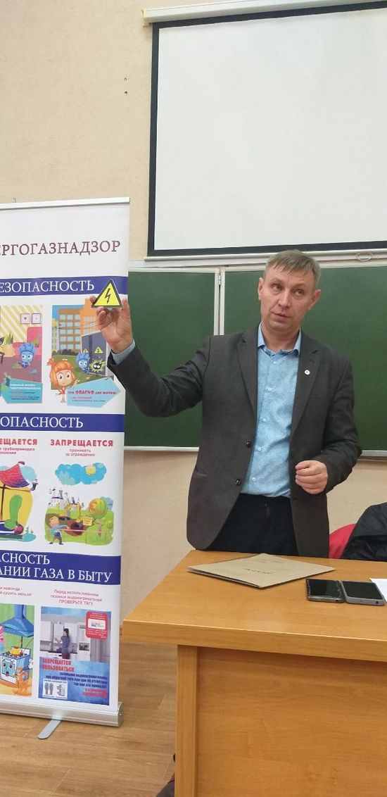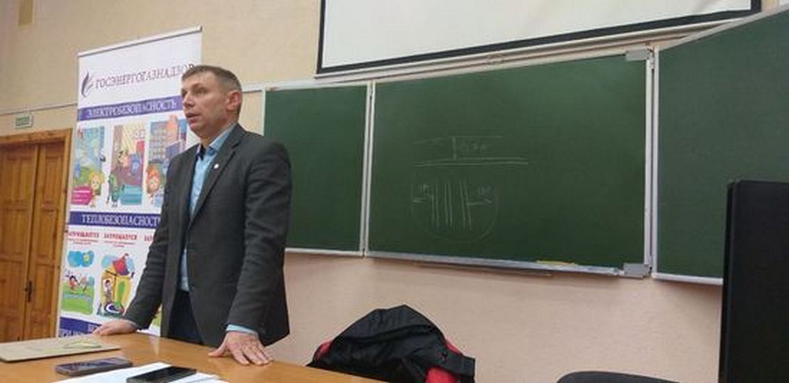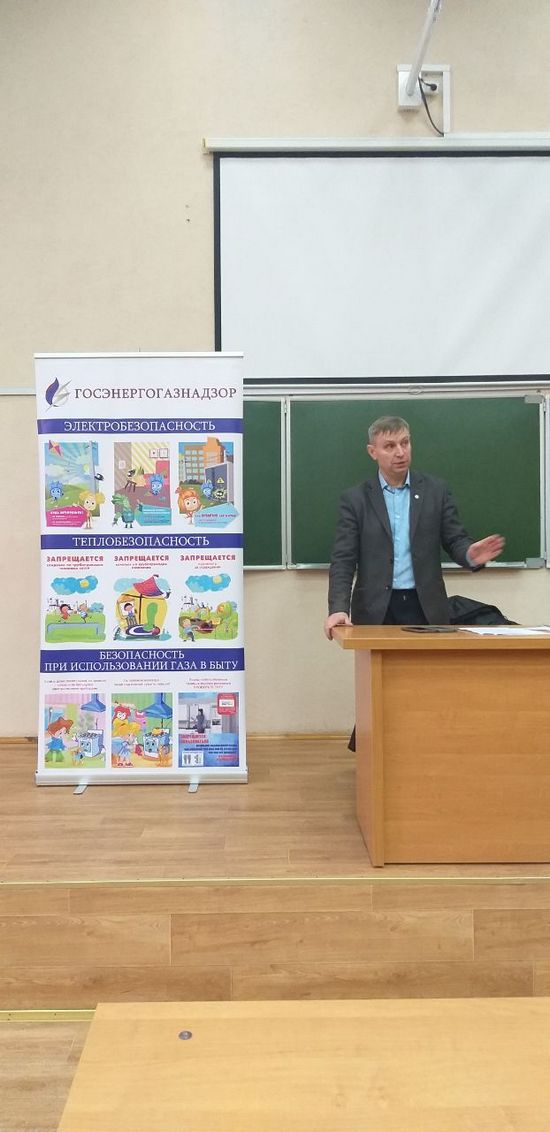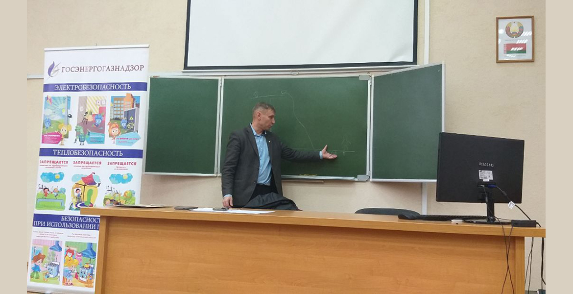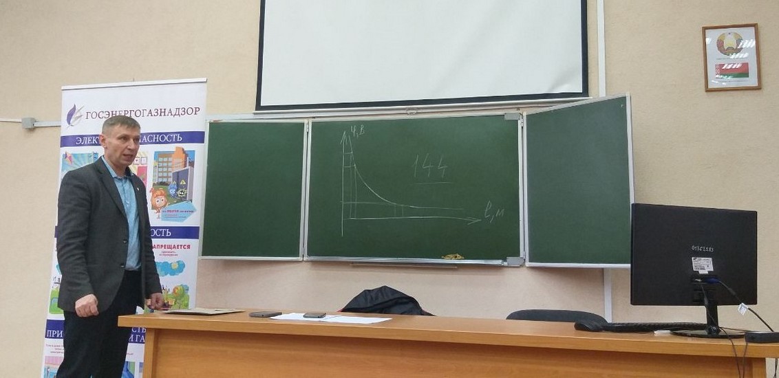Вопросам электробезопасности была посвящена встреча студентов первого курса факультета математики и естествознания и историко-филологического факультета с начальником электротехнической группы филиала государственного учреждения «Государственный энергетический и газовый надзор» по Могилевской области Е. А. Веремьевым.